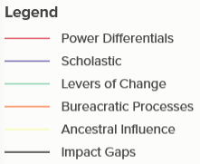 Colour-coded connections – of ancestral influence, power differentials, bureaucratic processes, impact gaps, and levers of change – enact a characterizing cast upon elements, linking them together in a variety of patterns, which are additionally interrelated with a personal scholastic connection scale which stresses my own particularity of reference point and though process in the map’s creation.
