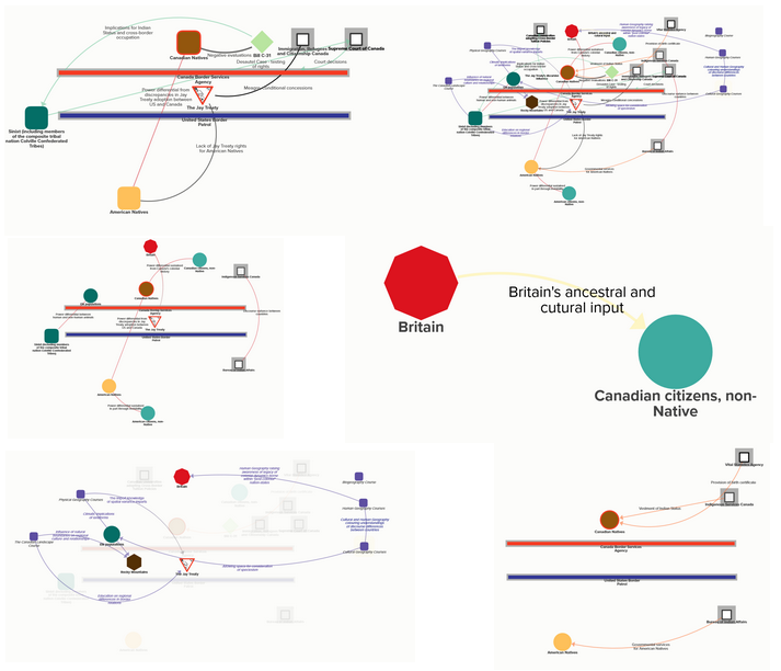 This website presentation allowed for interactive engagement with the Jay Treaty systems map, with separate “views” intending to indicate distinct patterns of category-specific processes and impact gaps within the system, in addition to amplifying the presence of missing points unacknowledged by my own map-making process. Further, the incorporation of semi-geographic correspondence in the placement of elements within the map allows an impression of how spatial patterns of influence, process, and actor agency differ between different categories of connection. Potentially, this multiple-view geographic approach further refines the potential for systems maps to aid in the collation and analysis of issues, and the delineation of their particular parameters and bounds.